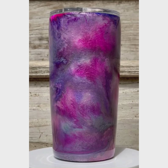 18.5oz stainless steel tumbler designed with a fun tie dye design (shades of pinks and purples, and touches of blue with peekaboo glitter).