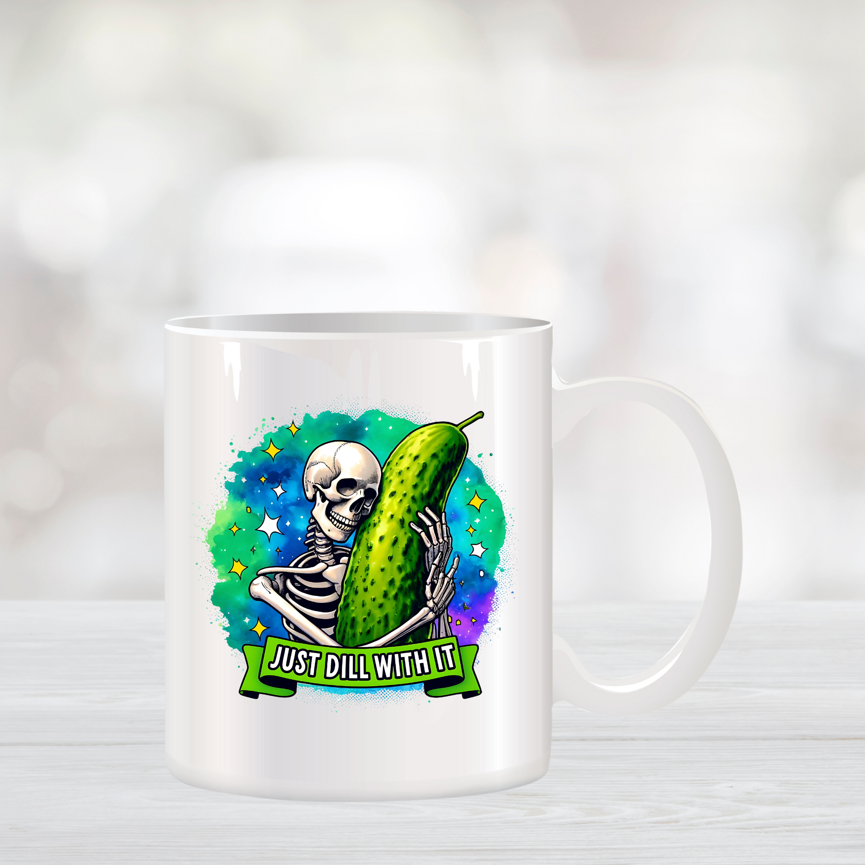 Coffee mug with skeleton and pickle just dill with it design.